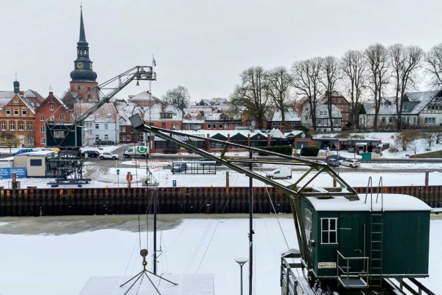 - den Stadthafen mit Museumskränen und der Cosmae-Kirchturm