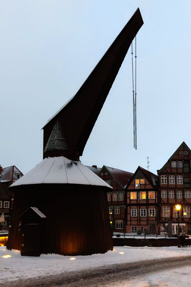 - den historischen Tretkran am Fischmarkt am Ufer der Schwinge beim Alten Hansehafen