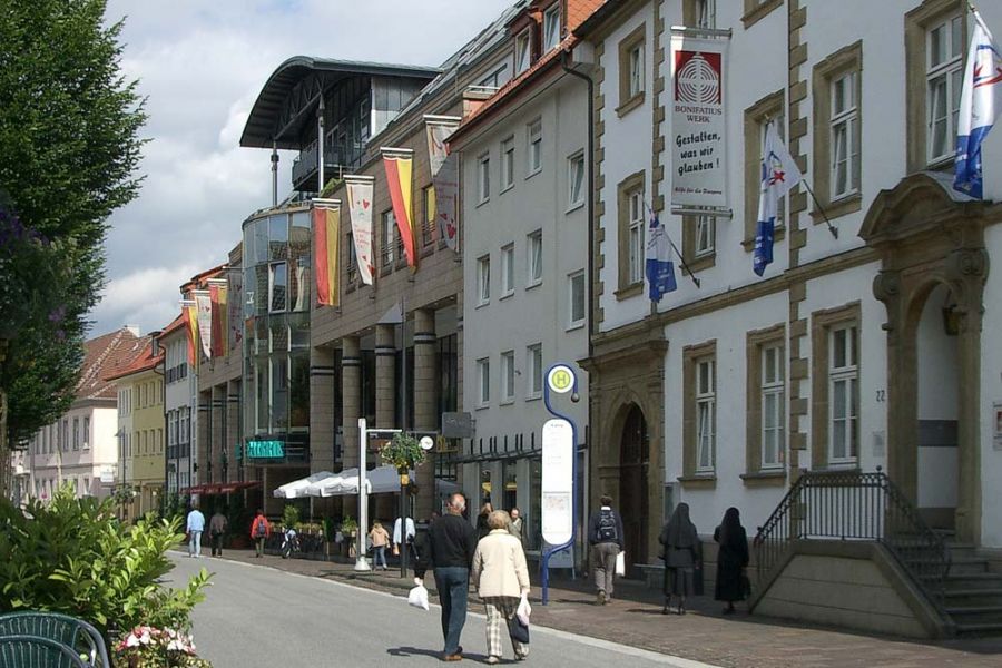 Es folgt die Fussgängerzone Kamp bis zur Einkaufspassage Libori-Galerie und endet beim mächtigen Hohen Dom St. Maria, St. Liborius, St. Kilian, der auch einfach Paderborner Dom genannt wird.
