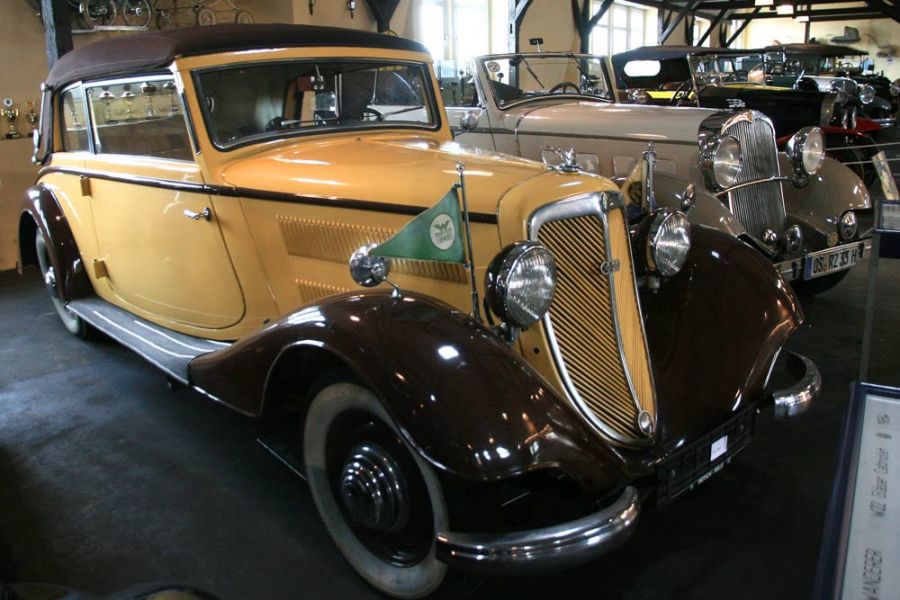 Automuseum Melle – edle deutsche Vorkriegs-Automobile, ein Wanderer W 22 Gläser Cabriolet vor einem Röhr 8 F