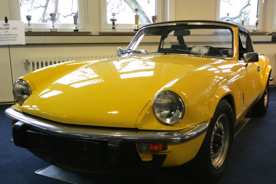 Automuseum Melle - der zitronengelbe Triumph Spitfire Mk IV sieht aus diesem Blickwinkel fast wie ein früher Porsche 911 aus