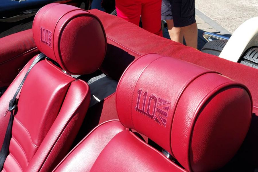 Morgan Plus 4 Roadster 110 Years Edition, Baujahr 2019 - die roten Ledersitze mit '110 Years'-EmblemMorgan Plus 4 Roadster 110 Years Edition, Baujahr 2019 - die roten Ledersitze mit '110 Years'-Emblem