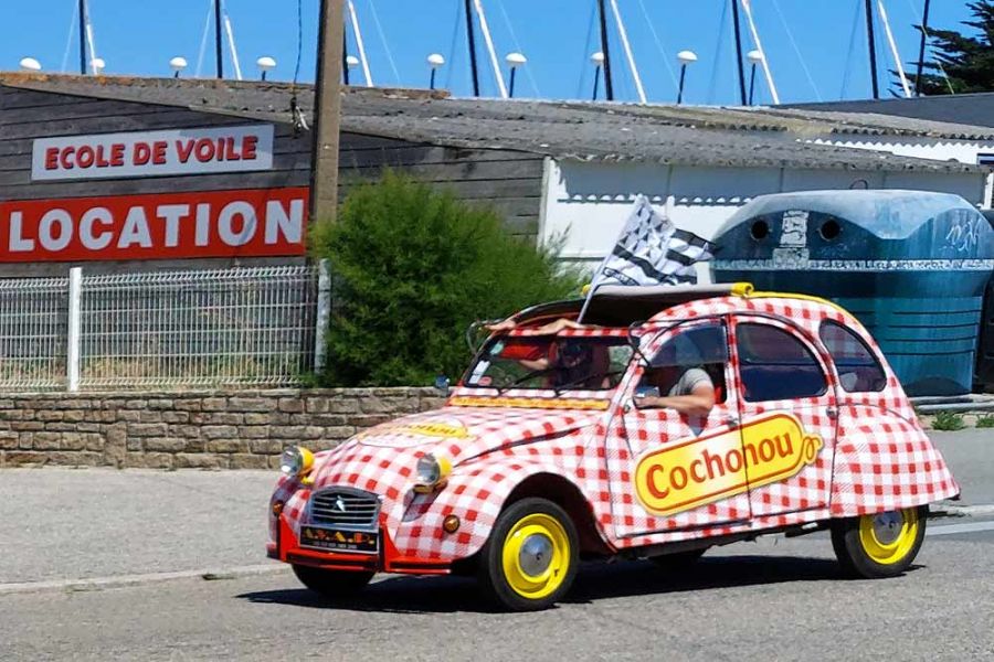 Ein hübsch lackierter Citroën 2 CV 6 'deux chevaux‘ in Port Haliguen auf der betonischen Halbinsel Quiberon in Frankreich