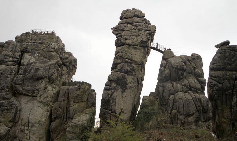 In die Externsteine wurden Grotten, Treppen, eine Höhenkapelle und weitere Strukturen eingearbeitet, darunter ein großes mittelalterliches Kreuzabnahmerelief im Freien.