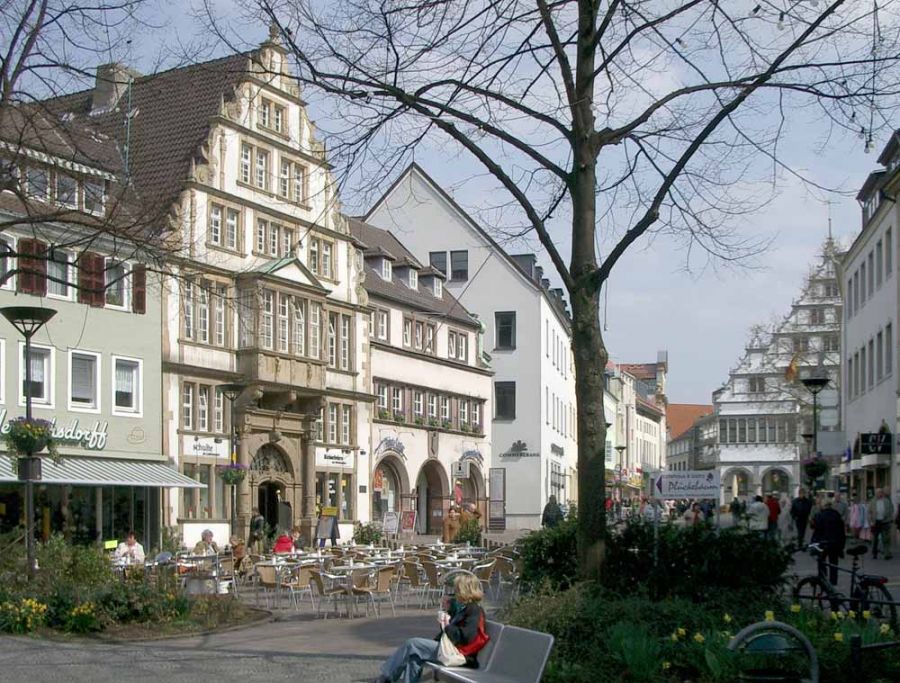 Unser kleiner Bummel durch die Innenstadt Paderborns beginnt am lang gezogenen Rathausplatz mit dem eindrucksvollen Rathaus und seiner geschmückten Fassade im Stil der Weserrenaissance,