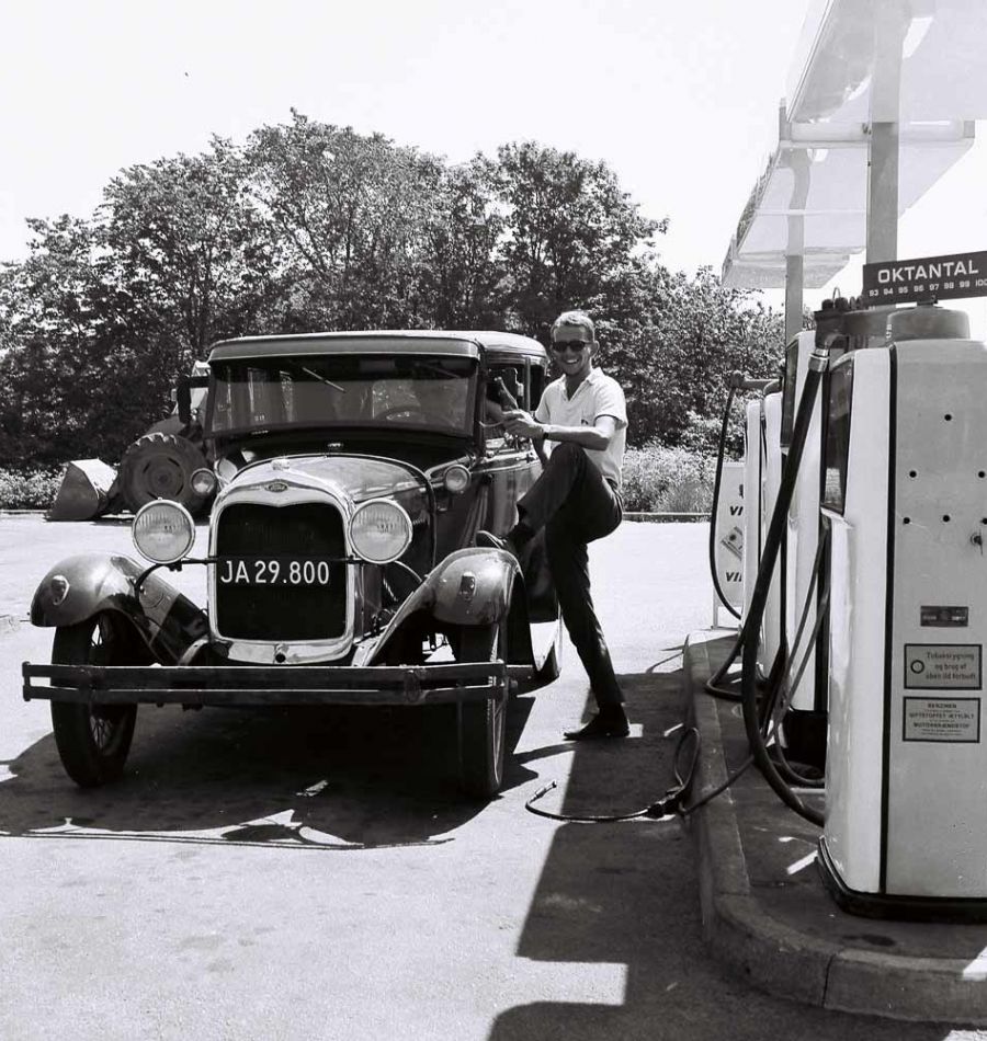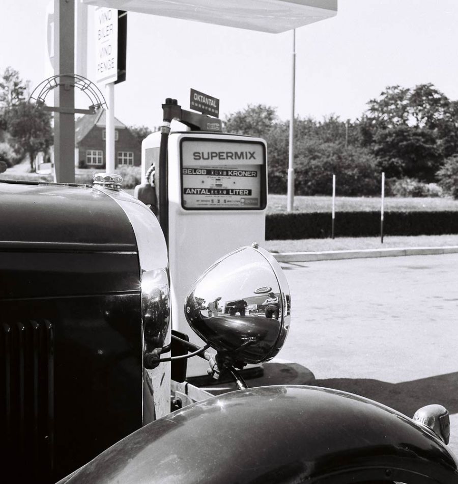Weinroter Lack, schwarze Kotflügel und chromglänzende Scheinwerfer – mit dem Ford A Fordor Sedan an der Tankstelle im Norden BornholmsWeinroter Lack, schwarze Kotflügel und chromglänzende Scheinwerfer – mit dem Ford A Fordor Sedan an der Tankstelle im Norden Bornholms